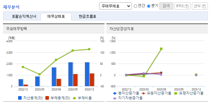 -2023년 12월 전년동기 대비 별도기준 매출액은 3.6% 감소, 영업이익은 적자전환, 당기순손실은 48.6% 증가. 신규 주력사업으로 추진하는 로봇 매출이 유의미하게 발생하지 않았고, 신사업 준비 등으로 인한 판매관리비 증가로 영업손실이 발생함. 2030년 글로벌 로보틱스 시장규모는 약 300조 원으로 전망하고 있음. 동사는 현재 로봇 관련 부품생산 및 조립을 위한 제조 라인 구축을 완료하고 다양한 소프트웨어 연구개발을 진행 중임.