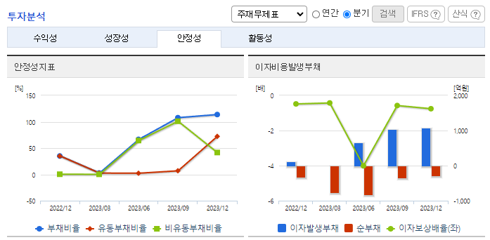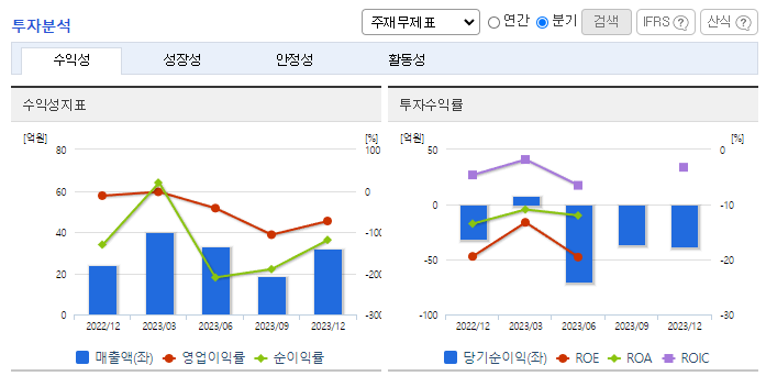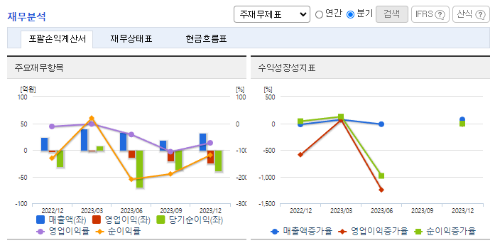 -2023년 12월 전년동기 대비 별도기준 매출액은 3.6% 감소, 영업이익은 적자전환, 당기순손실은 48.6% 증가. 신규 주력사업으로 추진하는 로봇 매출이 유의미하게 발생하지 않았고, 신사업 준비 등으로 인한 판매관리비 증가로 영업손실이 발생함. 2030년 글로벌 로보틱스 시장규모는 약 300조 원으로 전망하고 있음. 동사는 현재 로봇 관련 부품생산 및 조립을 위한 제조 라인 구축을 완료하고 다양한 소프트웨어 연구개발을 진행 중임.