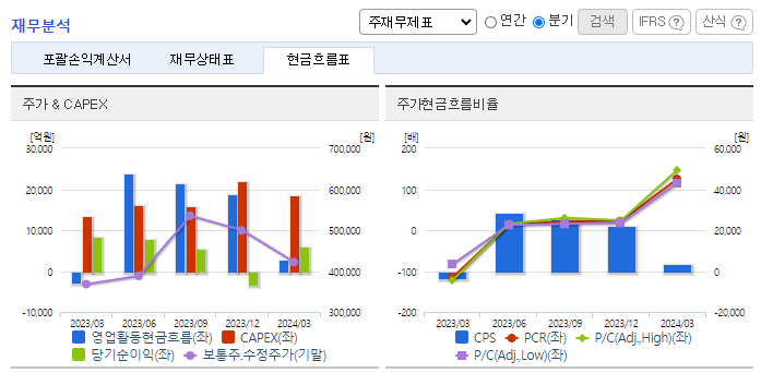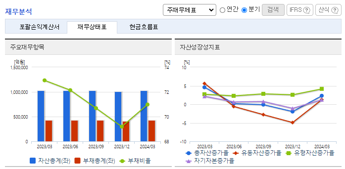 -2024년 3월 전년동기 대비 연결기준 매출액은 6.9% 감소, 영업이익은 17.3% 감소, 당기순이익은 25.6% 감소. 동사는 전기차용 이차전지의 시장규모 확대를 예상해 설비 확충 등 성장 사업 발굴을 위한 투자에 집중하고 있어서 매출 성장이 기대됨. 철강 판매량은 계절적 비수기와 일부 하공정 라인 수리 영향으로 소폭 감소하였고, 전기차 수요 둔화에 따른 리튬사업 수익성 전망 및 사업가치 할인이 불가피한 상황임.