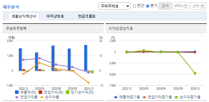 -2023년 12월 전년동기 대비 연결기준 매출액은 9.3% 감소, 영업이익은 85.3% 감소, 당기순이익 적자전환. 프레스 제품 매출 호조와 비철금속 트레이딩 매출이 신규 발생했음에도 불구하고 주력인 합금철 시장에서 부진하며 전체 외형은 소폭 축소됨. 원가율 악화로 영업이익이 크게 감소. 기술 영업을 바탕으로 홍보 전략 다변화, 고객 수요에 적합한 기종 개발, 해외 설비 투자 분에 대한 적극 대응을 통해 노력 중.