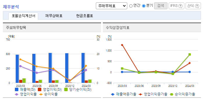 -2024년 3월 전년동기 대비 연결기준 매출액은 6.7% 증가, 영업이익은 18.1% 감소, 당기순이익은 24.3% 감소. 전 사업부문 고른 성장세로 외형은 확대되었으며, 고정비 동반 성장으로 영업이익은 감소세를 보임. 향후 전기차시대에도 자동차부품기업의 입지를 다지고자, ZLTube 기술을 개발한 엠에이치기술개발에 지분투자하여 경영권을 획득하였으며, 동사의 마케팅력을 이용해 영업활동 중임.