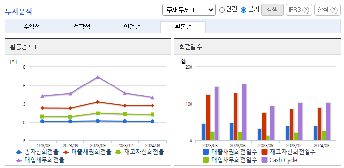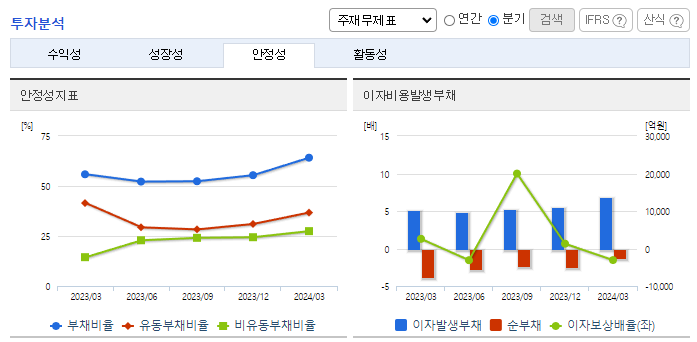 -2024년 3월 전년동기 대비 연결기준 매출액은 4.5% 증가, 영업이익 적자전환, 당기순이익 적자전환. 전년동기 대비 매출액은 4.5% 소폭 증가하였으나, 일부 제품의 원재료비 상승 및 환율 급등과 더불어 감가상각비, 운반보관비 등 판관비의 증가로 영업이익은 적자전환 하였음. 바이오 신소재 PO3G 상업설비는 연산 5,000톤 양산체제를 갖추었으며, 새로운 성장 동력으로서 본격적인 친환경 소재 시장 개척에 나설 예정임.