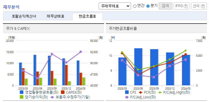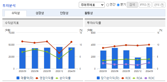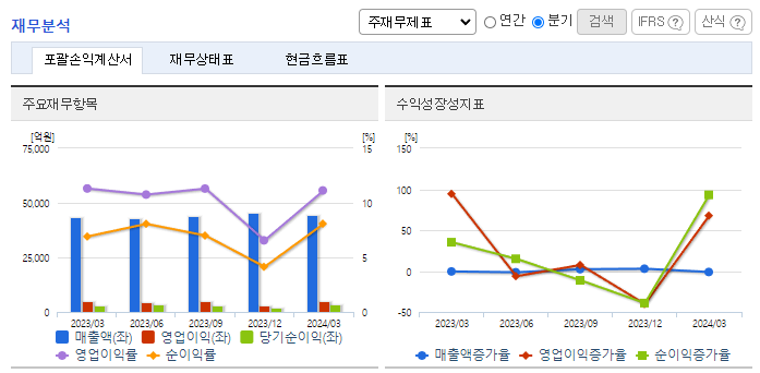 -2024년 3월 전년동기 대비 연결기준 매출액은 2.3% 증가, 영업이익은 0.8% 증가, 당기순이익은 21.5% 증가. 주력인 무선통신부문의 실적 확대와 함께 초고속 인터넷 등 유선부문의 선전으로 영업수익 확대됨. 원가율 상승에도 불구하고 영업수익 확대에 힘입어 영업이익 소폭 증가. 실적 개선을 위해 5G 통신망 구축을 주도하고, 빅데이터, AI를 접목한 서비스를 선보이는 등 다방면으로 노력 중임.