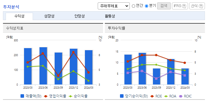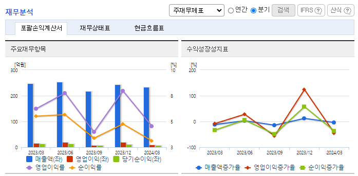 -2024년 3월 전년동기 대비 연결기준 매출액은 5.3% 감소, 영업이익은 31% 감소, 당기순이익은 46.4% 감소. 동사는 코인 노래방의 적극적으로 시장 개척에 나섰고, 젊은 층의 취향에 맞춰 다양한 코인 노래방용 기기에 다양한 효과 및 기능을 추가하는 식으로 신제품 개발을 함. 웹 콘텐츠를 대폭 강화한 점이 실적 상승을 이끌었고, K-콘텐츠의 세계 열풍이란 시대적 기회도 마련돼 있는 만큼 ‘글로벌 플랫폼 도약’을 하고자 함.