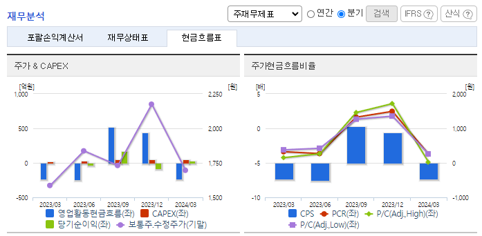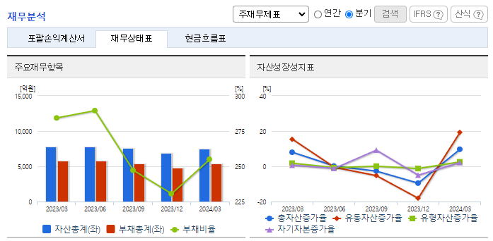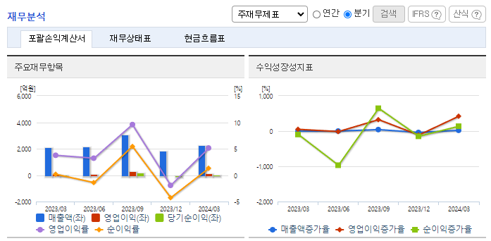 -2024년 3월 전년동기 대비 연결기준 매출액은 6.3% 증가, 영업이익은 45.4% 증가, 당기순이익은 865.1% 증가. 우모 산업과 임대 산업의 매출이 전년동기 대비 감소하였지만 전체 매출액 중 큰 비중을 차지하는 의류산업의 매출이 다소 증가하여 전체적인 실적에 긍정적으로 작용. 증치세 면세와 물류비를 절감할 수 있는 중개무역, 가공무역을 확대하여 매출액 노력에 힘쓰고 있음.