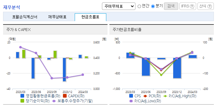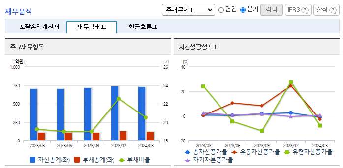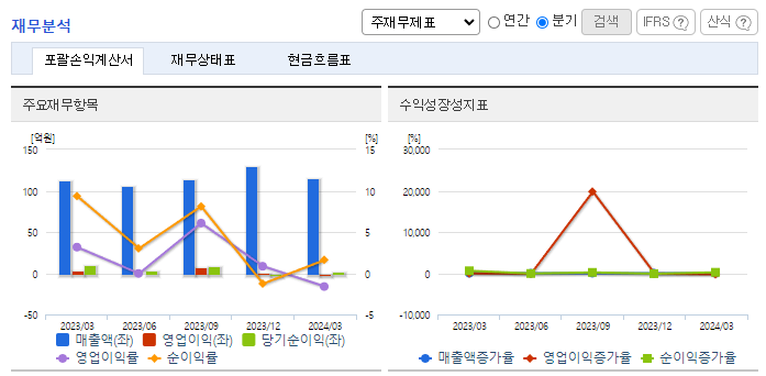 -2024년 3월 전년동기 대비 연결기준 매출액은 2% 증가, 영업이익 적자전환, 당기순이익은 82.5% 감소. 콘텐츠 확대 및 공급 노력을 통해 매출은 소폭 증가하였으나 투자 비용이 크게 증가하여 수익성이 하락하였음. 서비스 이용자 대상 드라마, 예능, 시사, 라디오, 연예뉴스, 영화, 해외드라마 등 콘텐츠와 연계된 온라인 광고 및 프로모션 사업 등을 운영하고 있으며, 자체제작 콘텐츠 공급 확대 및 서비스 강화에도 노력하고 있음.