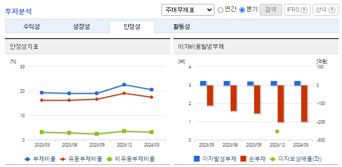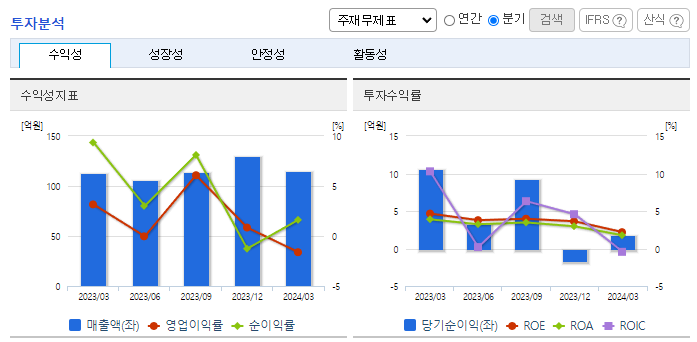 -2024년 3월 전년동기 대비 연결기준 매출액은 2% 증가, 영업이익 적자전환, 당기순이익은 82.5% 감소. 콘텐츠 확대 및 공급 노력을 통해 매출은 소폭 증가하였으나 투자 비용이 크게 증가하여 수익성이 하락하였음. 서비스 이용자 대상 드라마, 예능, 시사, 라디오, 연예뉴스, 영화, 해외드라마 등 콘텐츠와 연계된 온라인 광고 및 프로모션 사업 등을 운영하고 있으며, 자체제작 콘텐츠 공급 확대 및 서비스 강화에도 노력하고 있음.